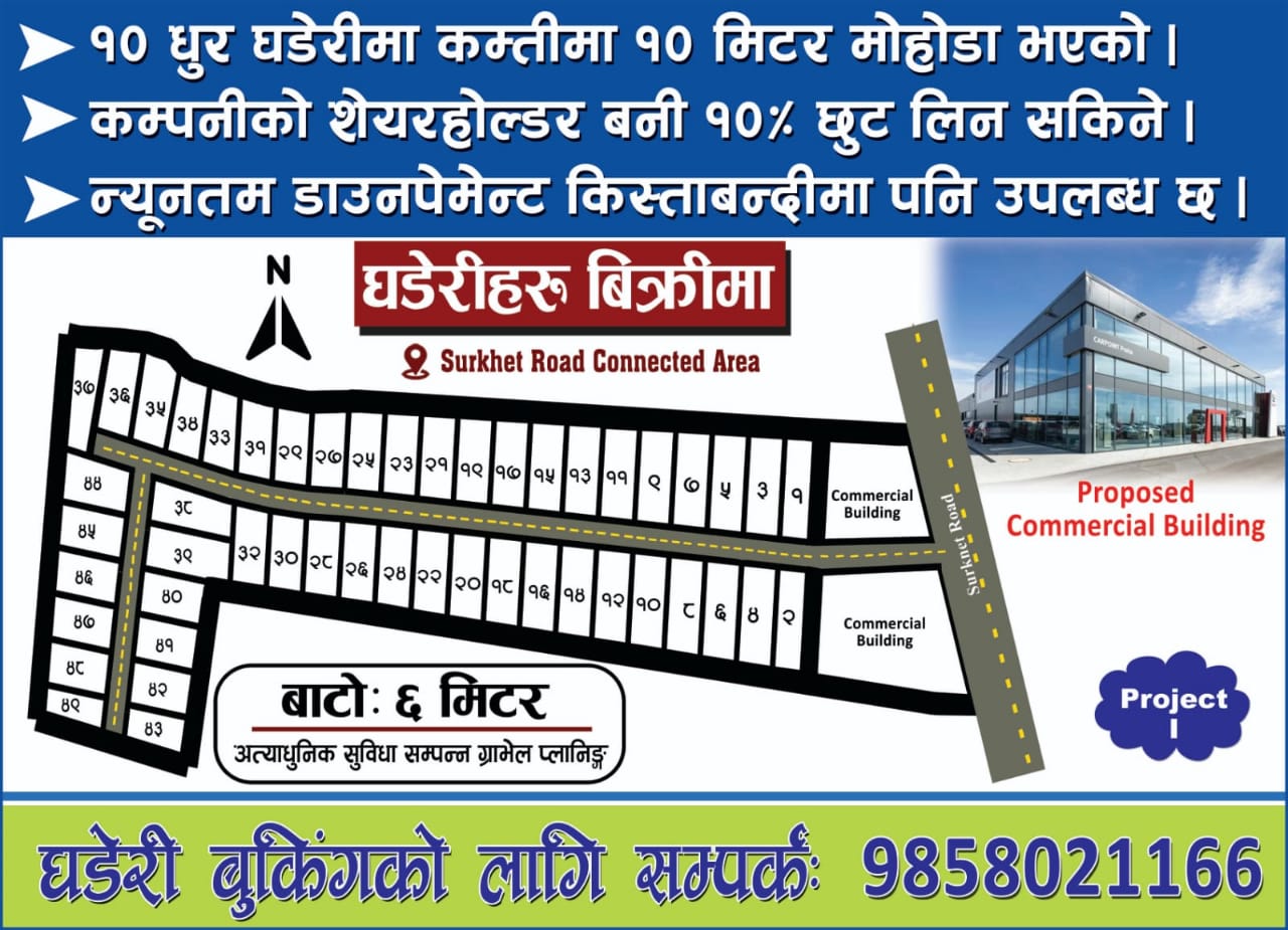Our first project has been developed with a real estate project in Nepalgunj. It is a 44 kattha land development project situated in Nepalgunj-Kohalpur road. We are planning to develop 6000 Square feet for vehicle showrooms which can accommodate 4 large showrooms consisting spare parts and servicing areas for the four wheel or two wheeler automobile brands. Then 16,000 square feet area for the godam. All these developed commercial properties will be rented out. From the day of incorporation, we have already started investing into share market. Since the market gone down, it is good time of entry in the share market.
