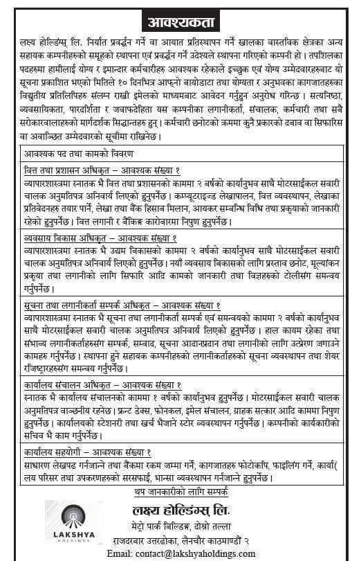 यस कम्पनीको संचालक श्री संजीव मैनालीले पेश गर्नुभएको राजीनामा स्वीकृत गरिएको हुँदा रिक्त रहेको संचालक पद परिपूर्ति गर्नको लागि यो सूचना प्रकाशित गरिएको छ । लक्ष्य क्यापिटल लि. का इच्छुक शेयरधनीहरुबाट तपशिलको गुगल फर्म भरि मिति २०८१/१/१५ गते भित्र दरखास्तका लागी आव्हान गरिन्छ ।