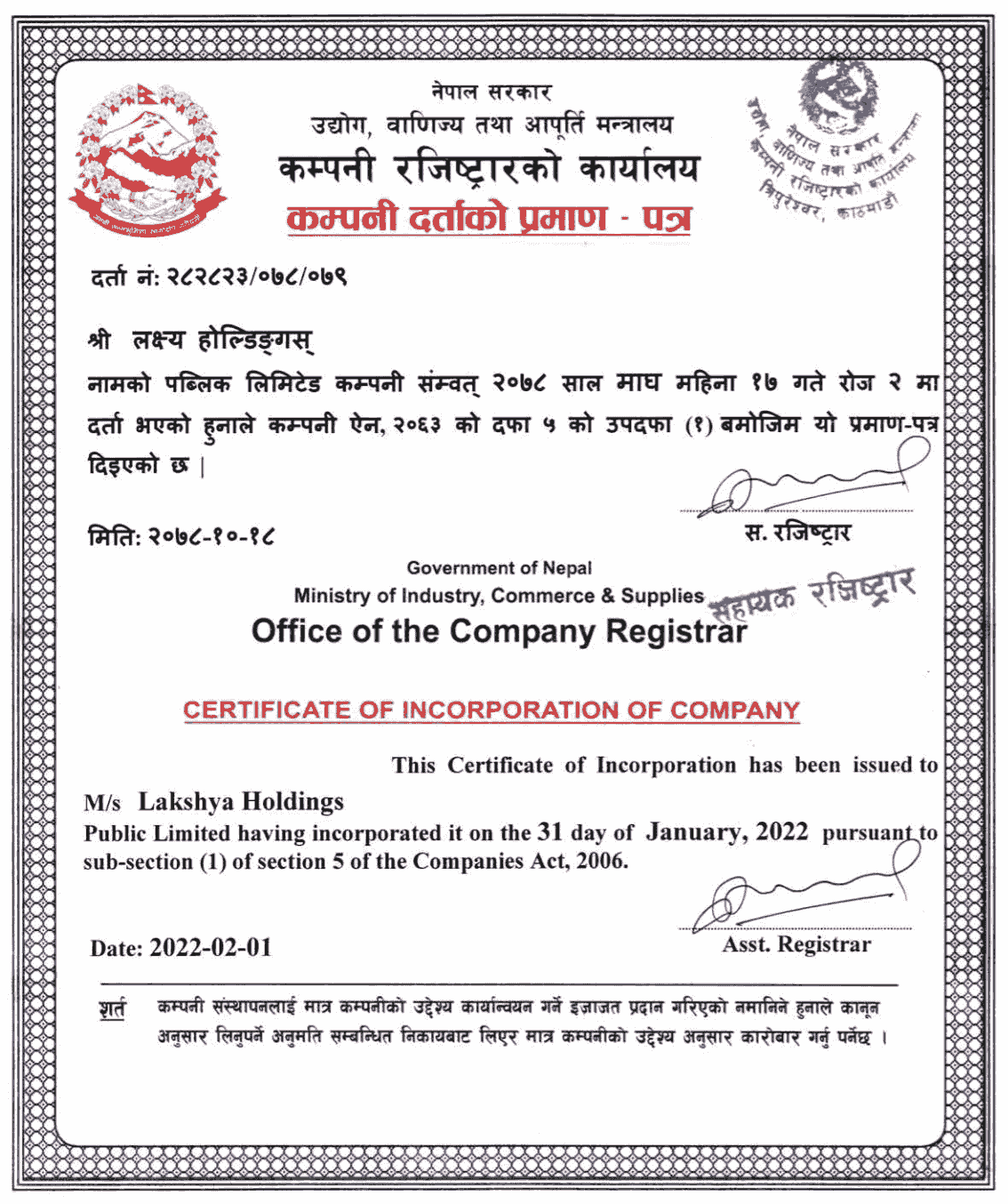 हामी लक्ष्य क्यापिटल संग सम्बन्धित सबैको लागि खुसीको खबर छ । २०२२ जनवरी २९ सम्म शतप्रतिशत शेयर रकम बुझाउनुहुनेहरुमध्ये २६६ जनाको प्रबन्धपत्र, नियमावलीमा हस्ताक्षर लिएर हामीले कम्पनी दर्ता गराएका छौं ।